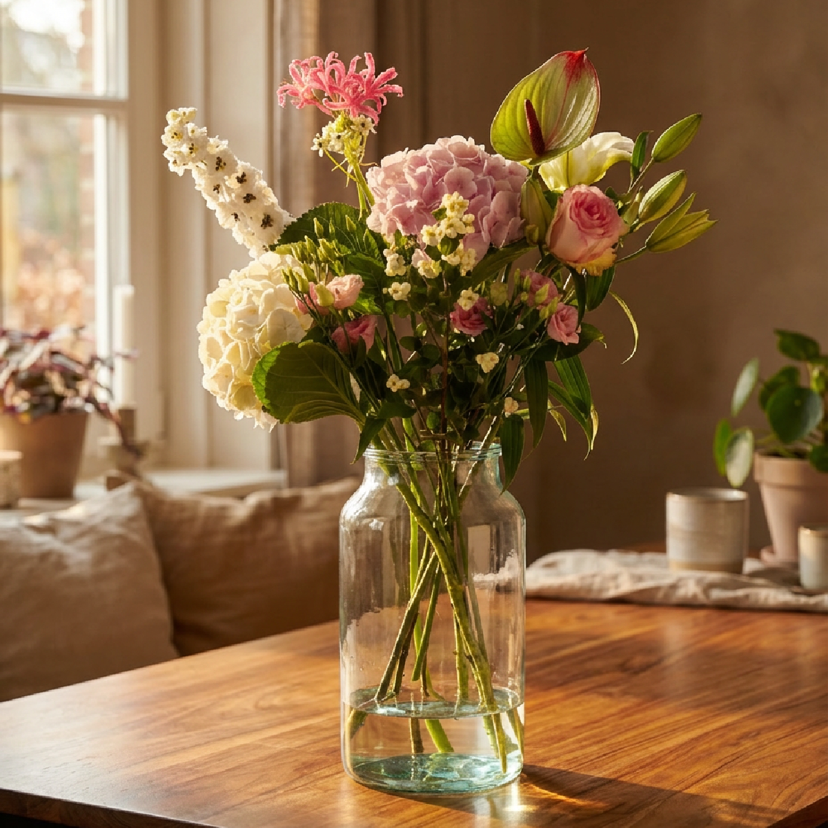 Alba is een romantisch wit-roze plukboeket met een zachte, elegante uitstraling. Je ziet volle hortensia’s (wit en blush-roze), een lichtroze roos, sierlijke lelieknoppen en speelse accenten zoals nerine en luchtige bloemtakjes die het boeket hoogte en verfijning geven. Fris, zacht en stijlvol — perfect als liefdevol cadeau, felicitatie of om een ruimte subtiel op te fleuren. Dit product is het boeket zónder vaas (vaas is apart te bestellen). (Samenstelling kan licht variëren per seizoen en beschikbaarheid, maar de pastel/romantische stijl blijft gelijk.)