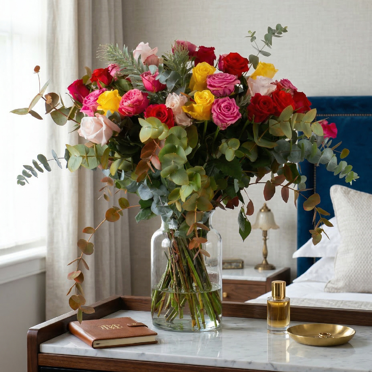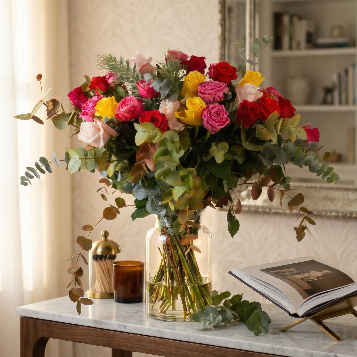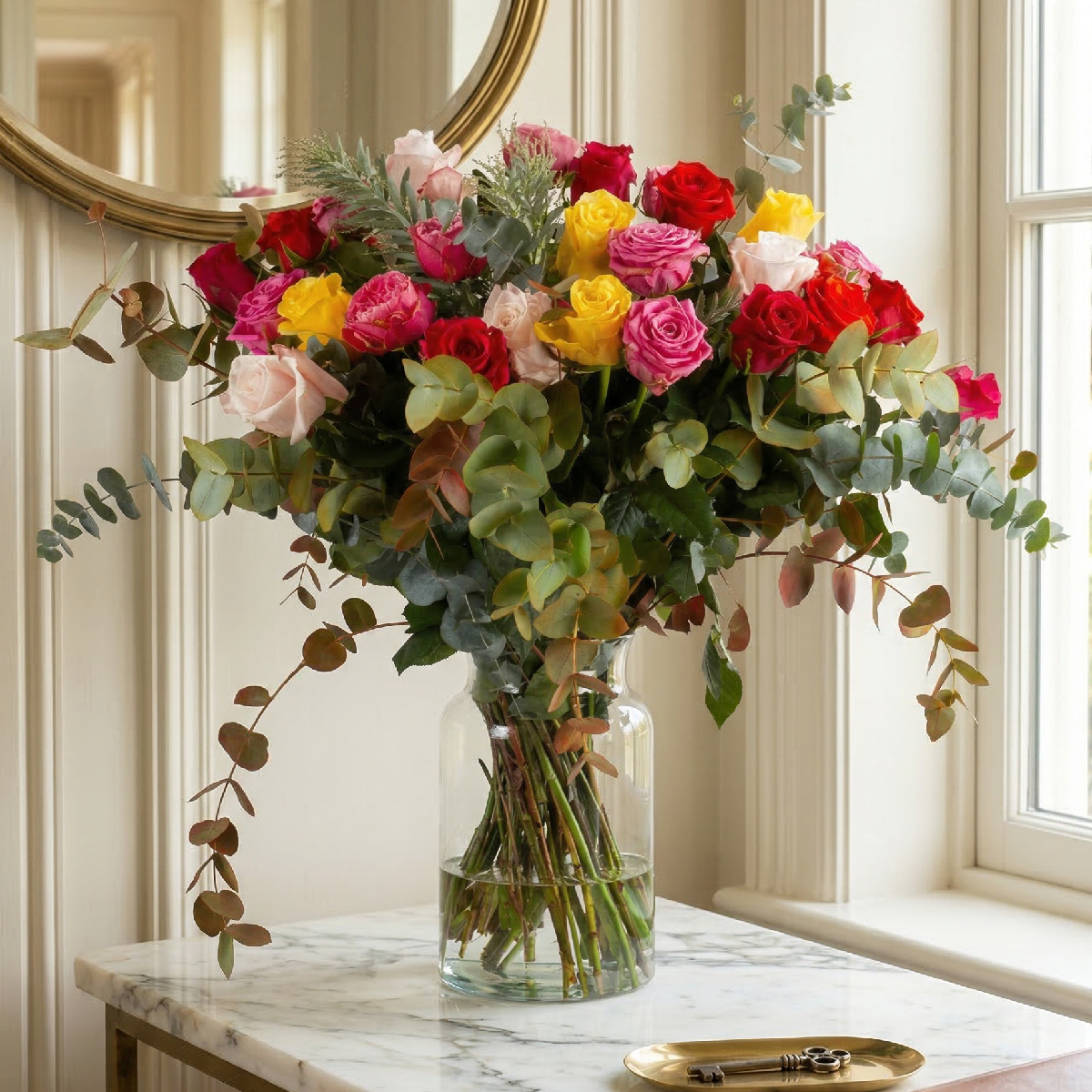 Elor is een royaal en romantisch rozenboeket in een warme, kleurrijke mix van rood, fuchsia, roze, geel en zacht crème. Rijk gevuld met eucalyptus en fris groen voor een luxe, volle en speelse uitstraling. Perfect als lief cadeau, felicitatie of om iemand écht in het zonnetje te zetten. Dit product is het boeket exclusief vaas (vaas is apart te bestellen). Bloemen kunnen door seizoen en dagaanvoer licht variëren, altijd in dezelfde stijl en kleurbeleving.