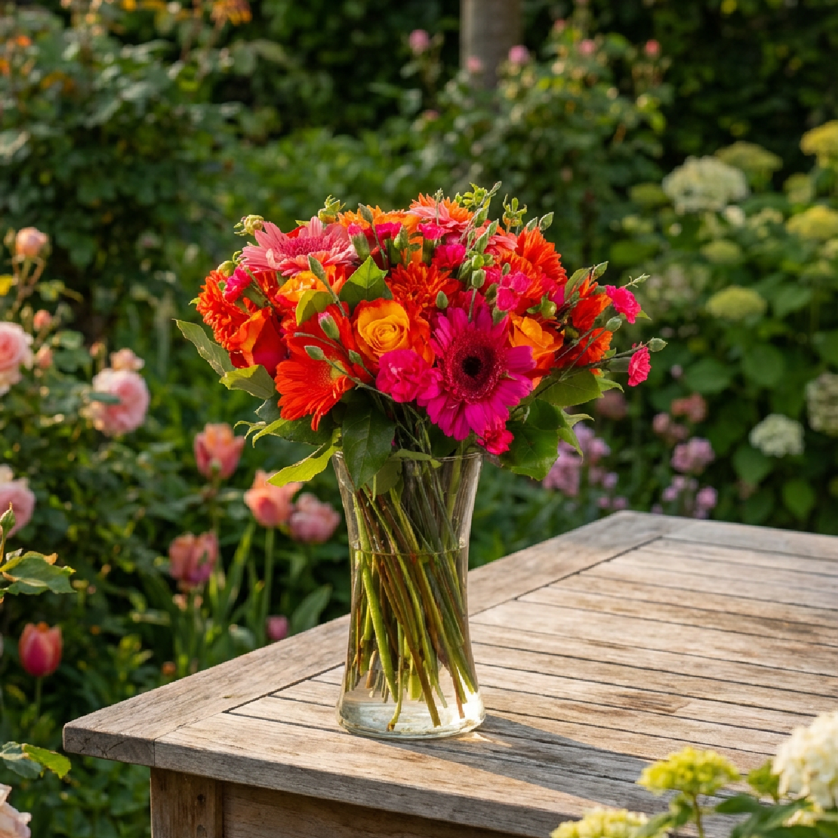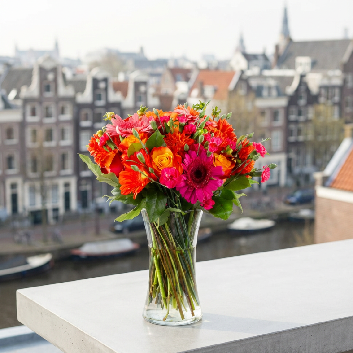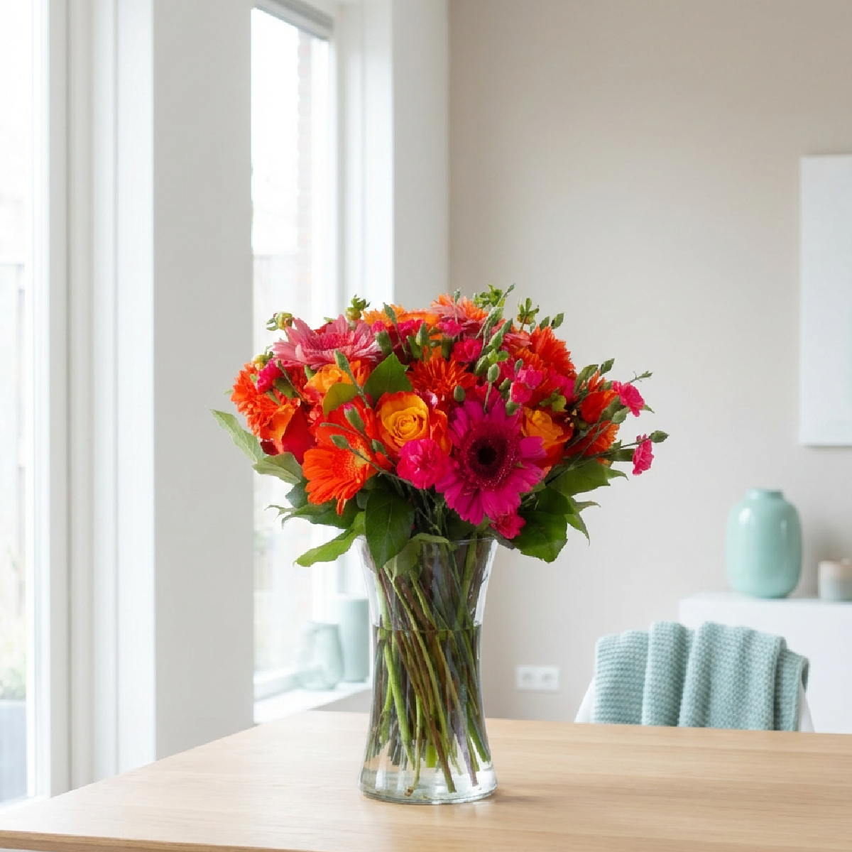 Elyra is een sprankelend plukboeket vol warme energie. De combinatie van oranje rozen, fuchsia/roze gerbera’s en speelse seizoensbloemen zorgt voor een compact maar rijk gevuld boeket met een echte wow-kleurmix. Perfect om iemand op te fleuren, te feliciteren of als vrolijke eyecatcher in huis. Dit product is het boeket exclusief vaas (vaas is apart te bestellen). Bloemen kunnen door seizoen en dagaanvoer licht variëren, altijd in dezelfde stijl en kleurbeleving.
