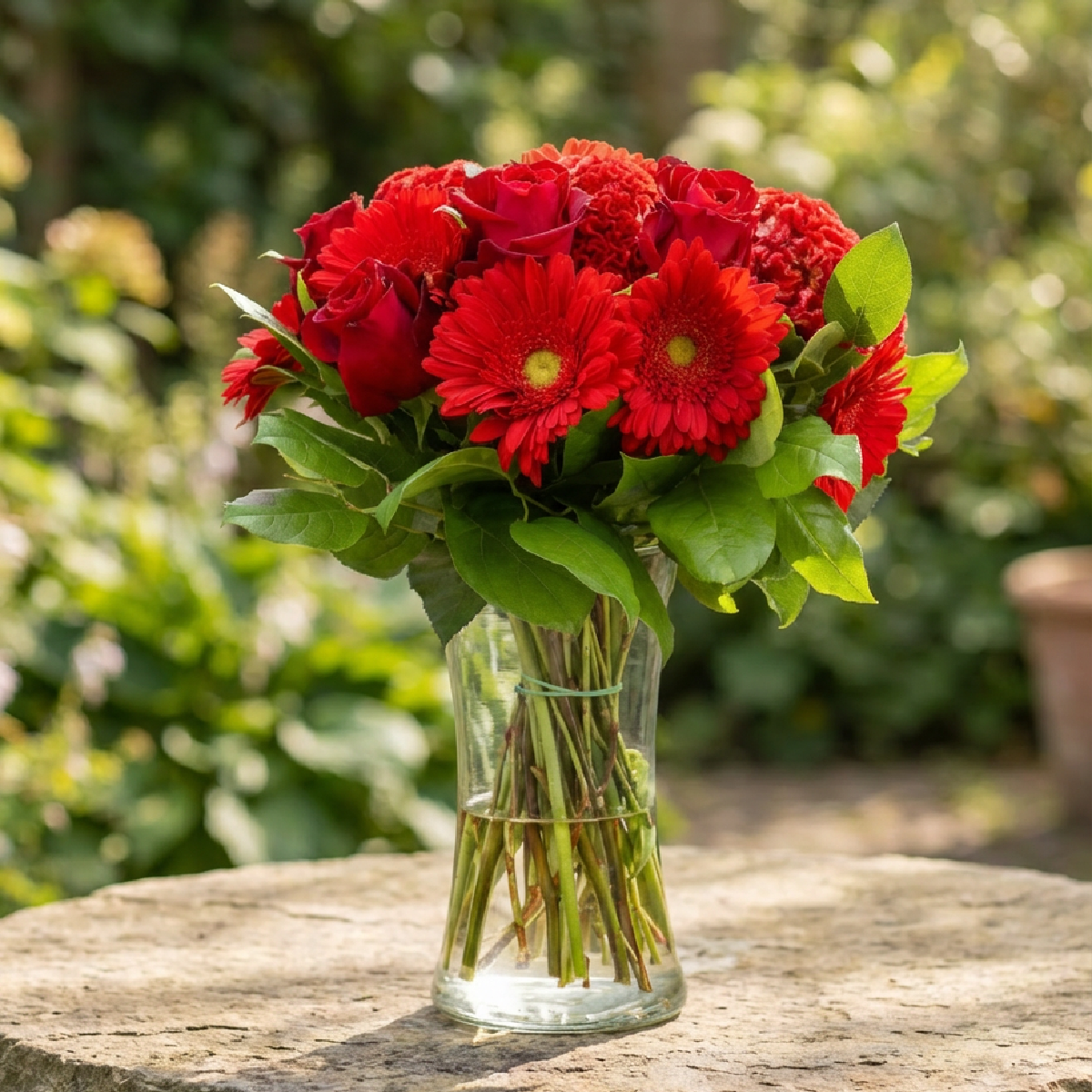 Pura is een krachtig, klassiek rond boeket in diepe roodtinten. Met rode gerbera’s en rode rozen, aangevuld met volle seizoensaccenten en fris groen, heeft dit boeket een rijke, warme uitstraling. Een tijdloze keuze om liefde, waardering of een warm gebaar over te brengen — perfect voor een verjaardag, jubileum of “gewoon omdat het kan”. Dit product is het boeket exclusief vaas (vaas is apart te bestellen). Samenstelling kan door dagaanvoer licht variëren, altijd in dezelfde stijl en kleurbeleving.