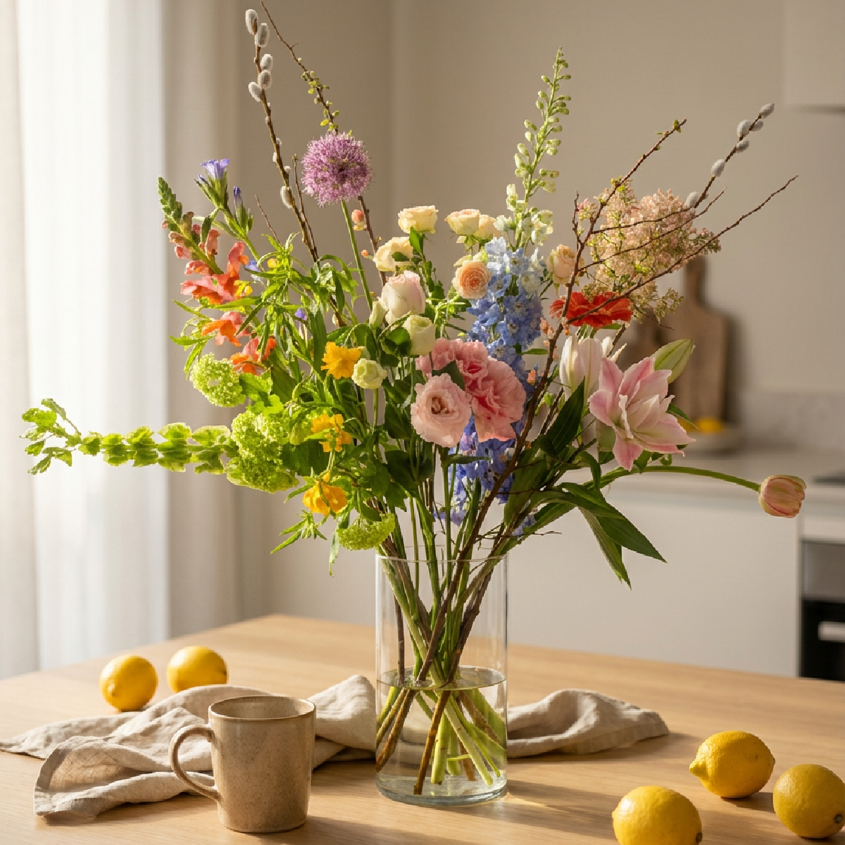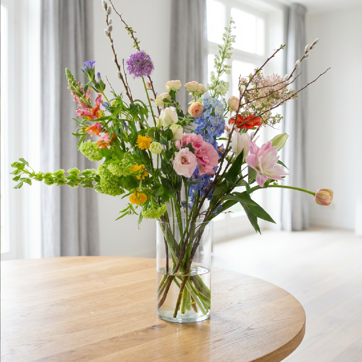 Serai is een luchtig en artistiek plukboeket met een speelse mix van zachte pasteltinten, frisse groenen, blauwe accenten en sierlijke takken. De natuurlijke, losse vorm en kleurrijke samenstelling geven dit boeket een moderne, elegante en levendige uitstraling. Perfect als stijlvol cadeau, felicitatie of frisse blikvanger in huis. Dit product is het boeket zónder vaas (vaas is apart te bestellen).