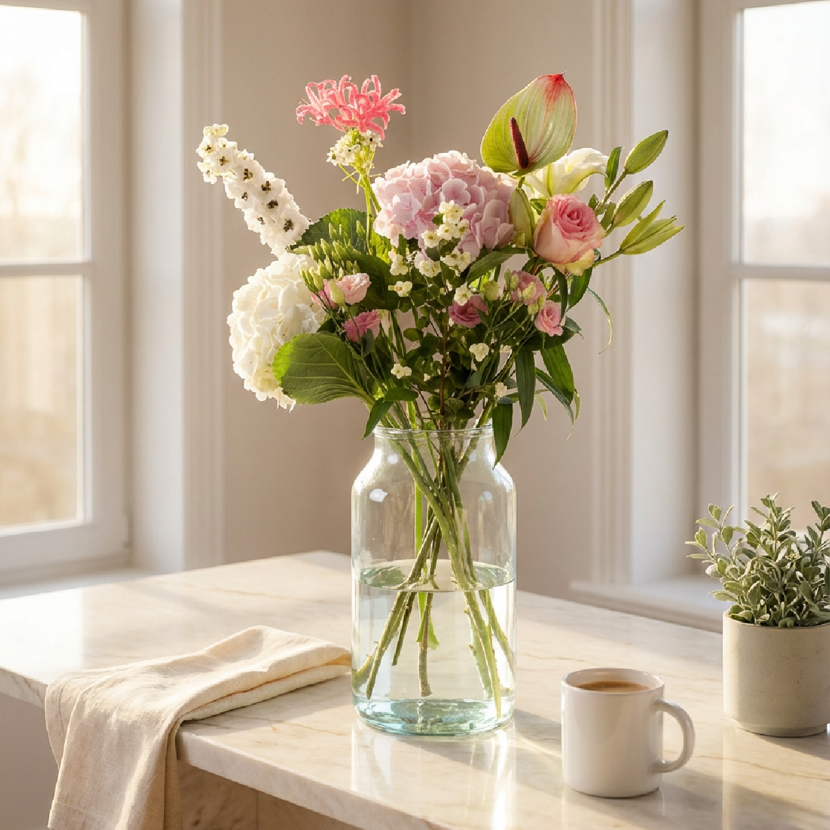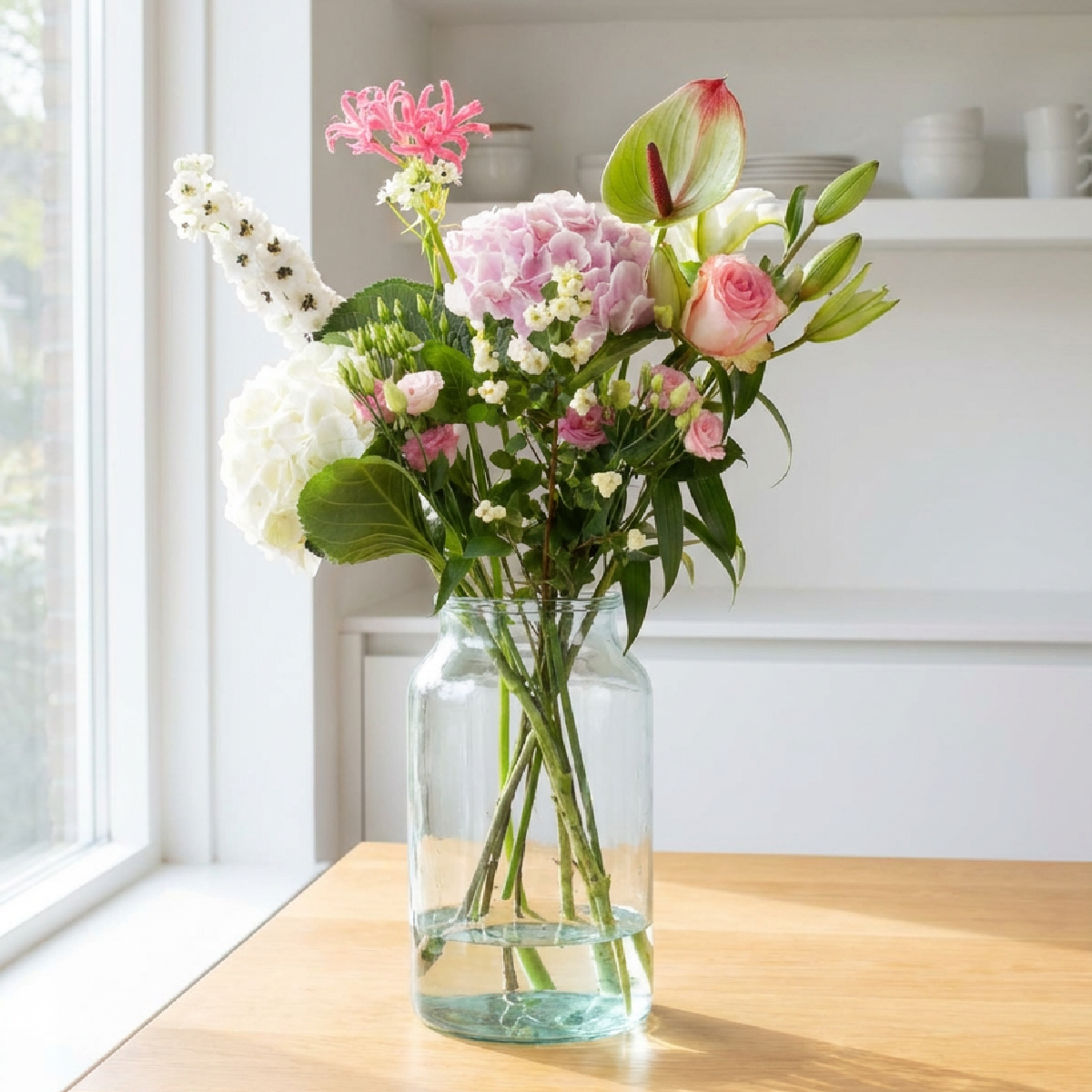 Alba is een romantisch wit-roze plukboeket met een zachte, elegante uitstraling. Je ziet volle hortensia’s (wit en blush-roze), een lichtroze roos, sierlijke lelieknoppen en speelse accenten zoals nerine en luchtige bloemtakjes die het boeket hoogte en verfijning geven. Fris, zacht en stijlvol — perfect als liefdevol cadeau, felicitatie of om een ruimte subtiel op te fleuren. Dit product is het boeket zónder vaas (vaas is apart te bestellen). (Samenstelling kan licht variëren per seizoen en beschikbaarheid, maar de pastel/romantische stijl blijft gelijk.)