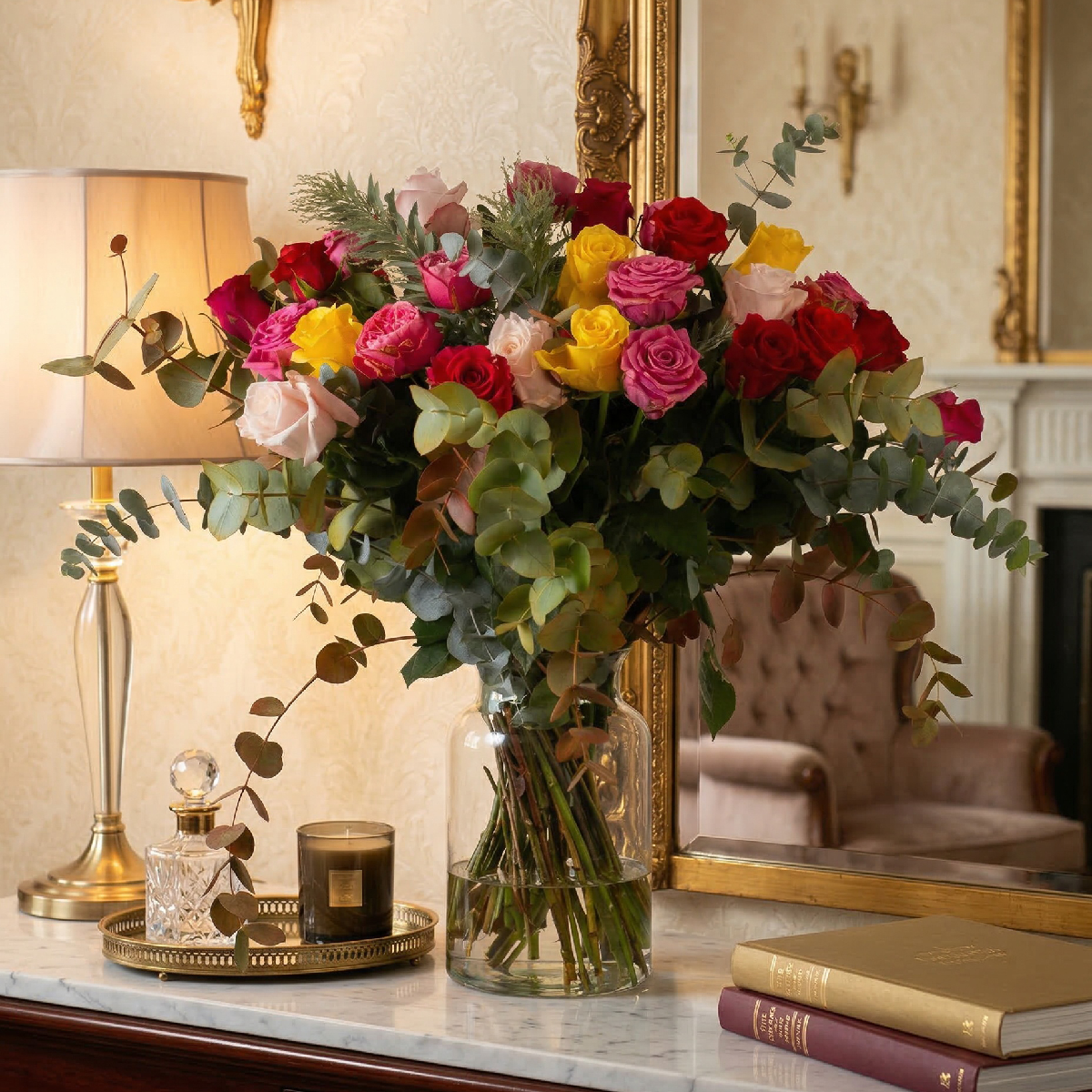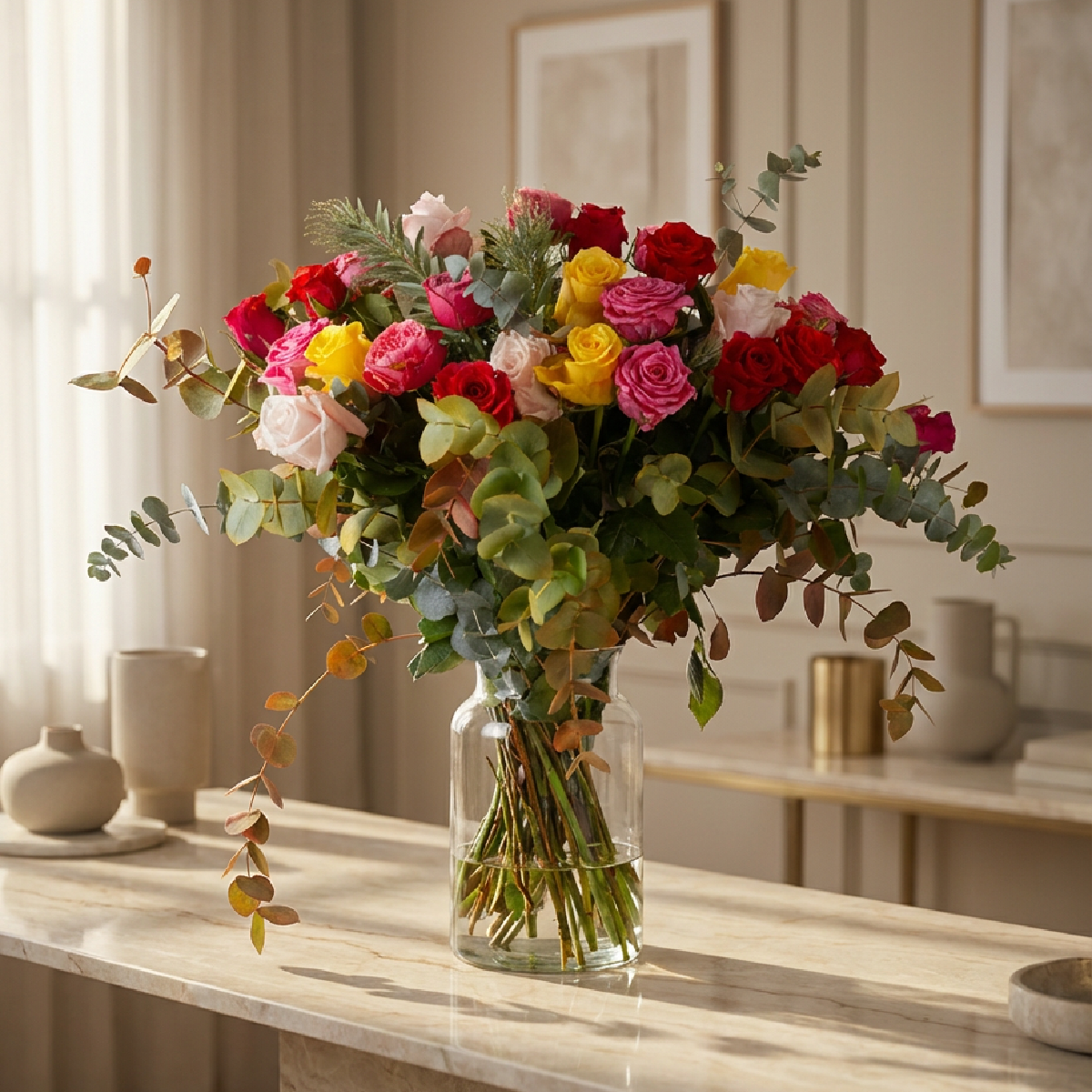 Elor is een royaal en romantisch rozenboeket in een warme, kleurrijke mix van rood, fuchsia, roze, geel en zacht crème. Rijk gevuld met eucalyptus en fris groen voor een luxe, volle en speelse uitstraling. Perfect als lief cadeau, felicitatie of om iemand écht in het zonnetje te zetten. Dit product is het boeket exclusief vaas (vaas is apart te bestellen). Bloemen kunnen door seizoen en dagaanvoer licht variëren, altijd in dezelfde stijl en kleurbeleving.