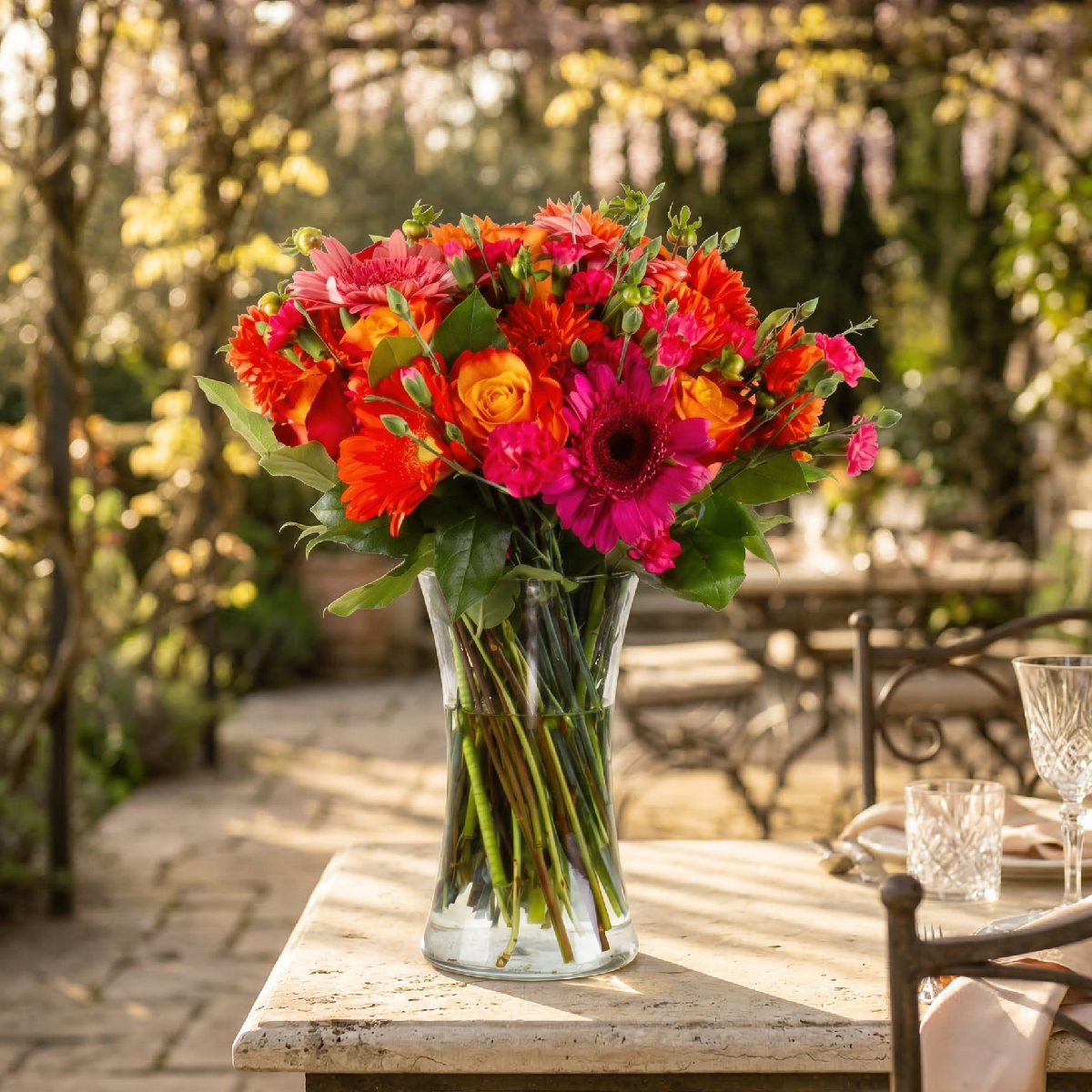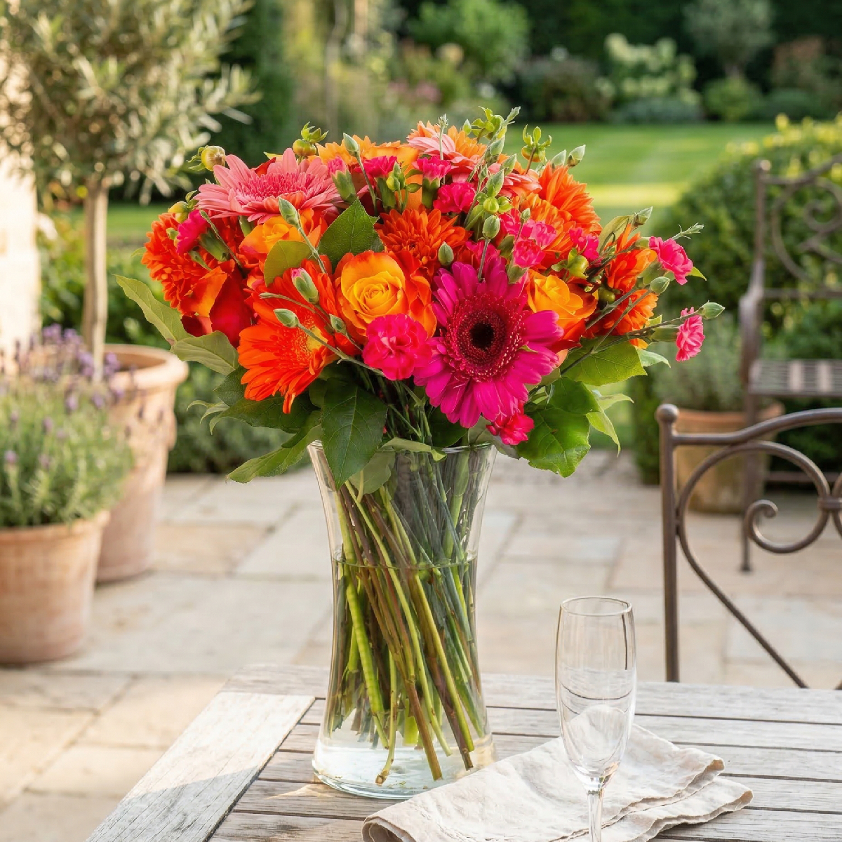 Elyra is een sprankelend plukboeket vol warme energie. De combinatie van oranje rozen, fuchsia/roze gerbera’s en speelse seizoensbloemen zorgt voor een compact maar rijk gevuld boeket met een echte wow-kleurmix. Perfect om iemand op te fleuren, te feliciteren of als vrolijke eyecatcher in huis. Dit product is het boeket exclusief vaas (vaas is apart te bestellen). Bloemen kunnen door seizoen en dagaanvoer licht variëren, altijd in dezelfde stijl en kleurbeleving.