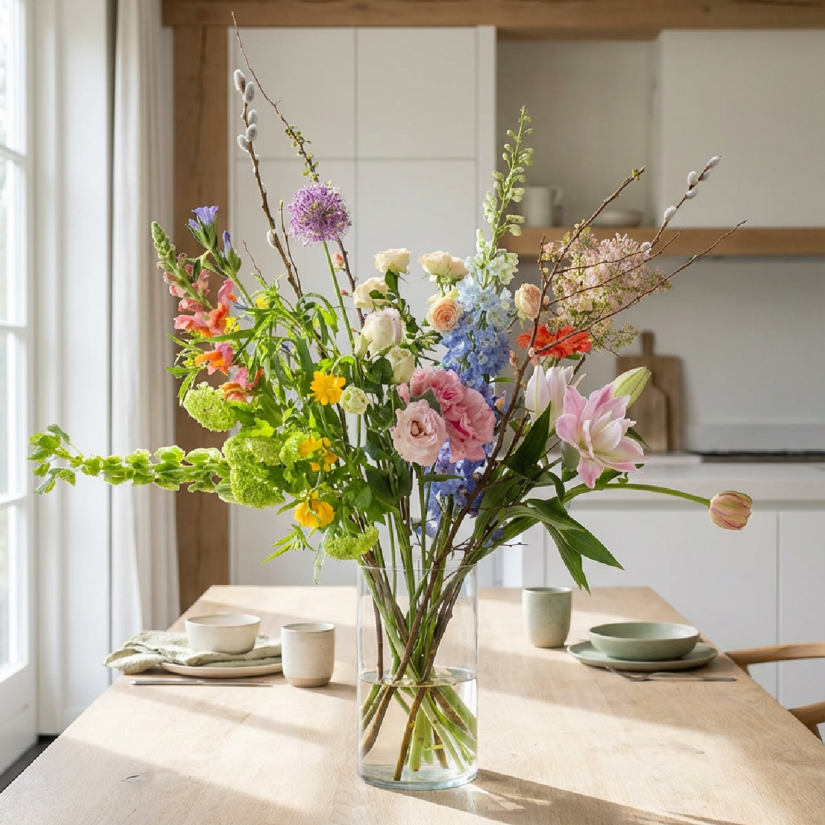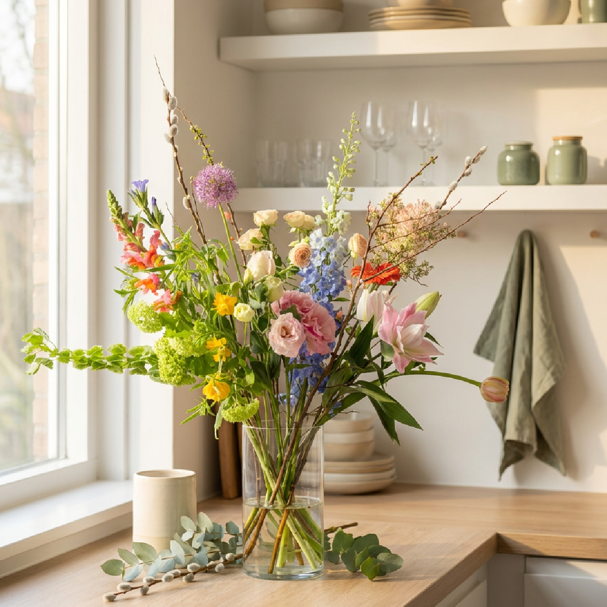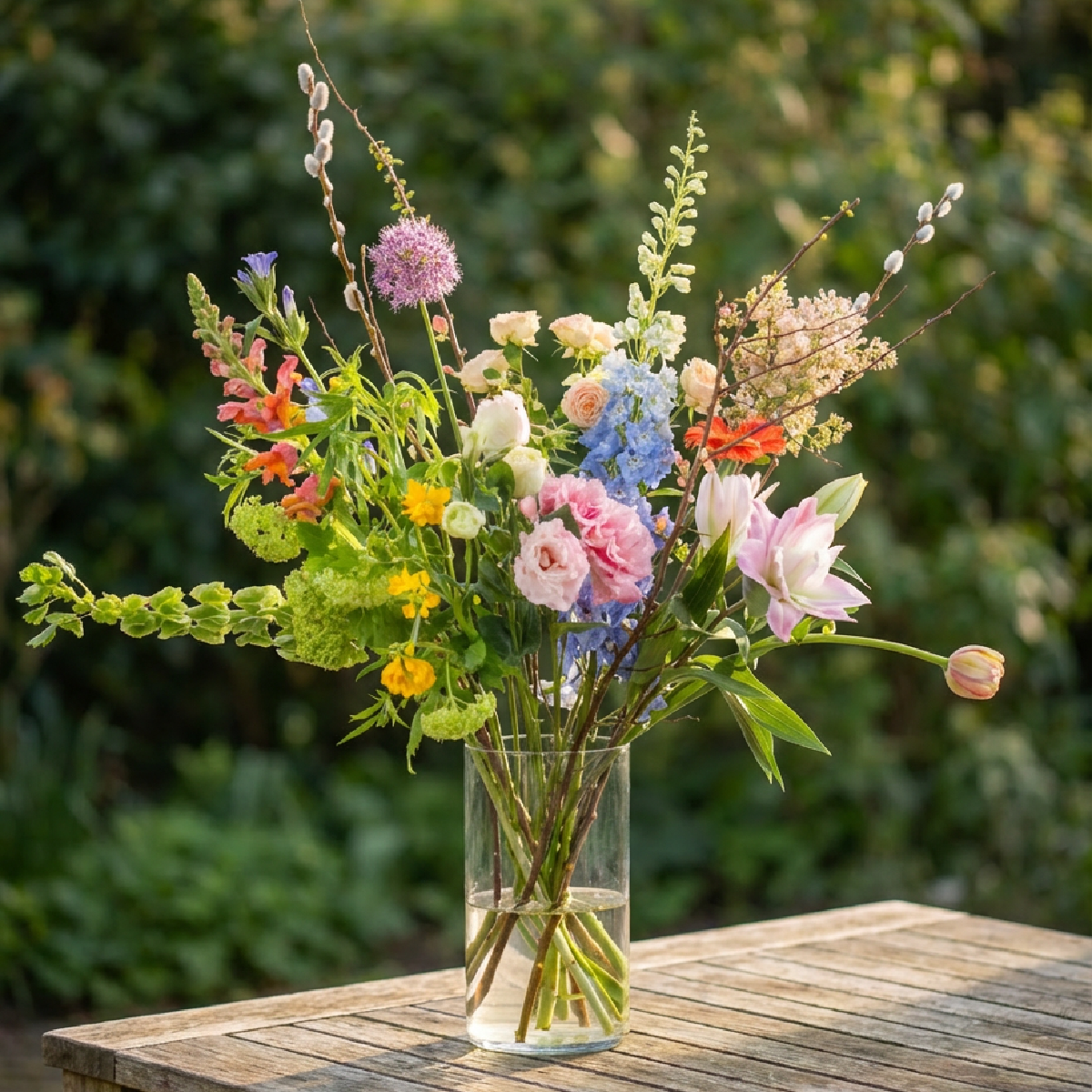Serai is een luchtig en artistiek plukboeket met een speelse mix van zachte pasteltinten, frisse groenen, blauwe accenten en sierlijke takken. De natuurlijke, losse vorm en kleurrijke samenstelling geven dit boeket een moderne, elegante en levendige uitstraling. Perfect als stijlvol cadeau, felicitatie of frisse blikvanger in huis. Dit product is het boeket zónder vaas (vaas is apart te bestellen).